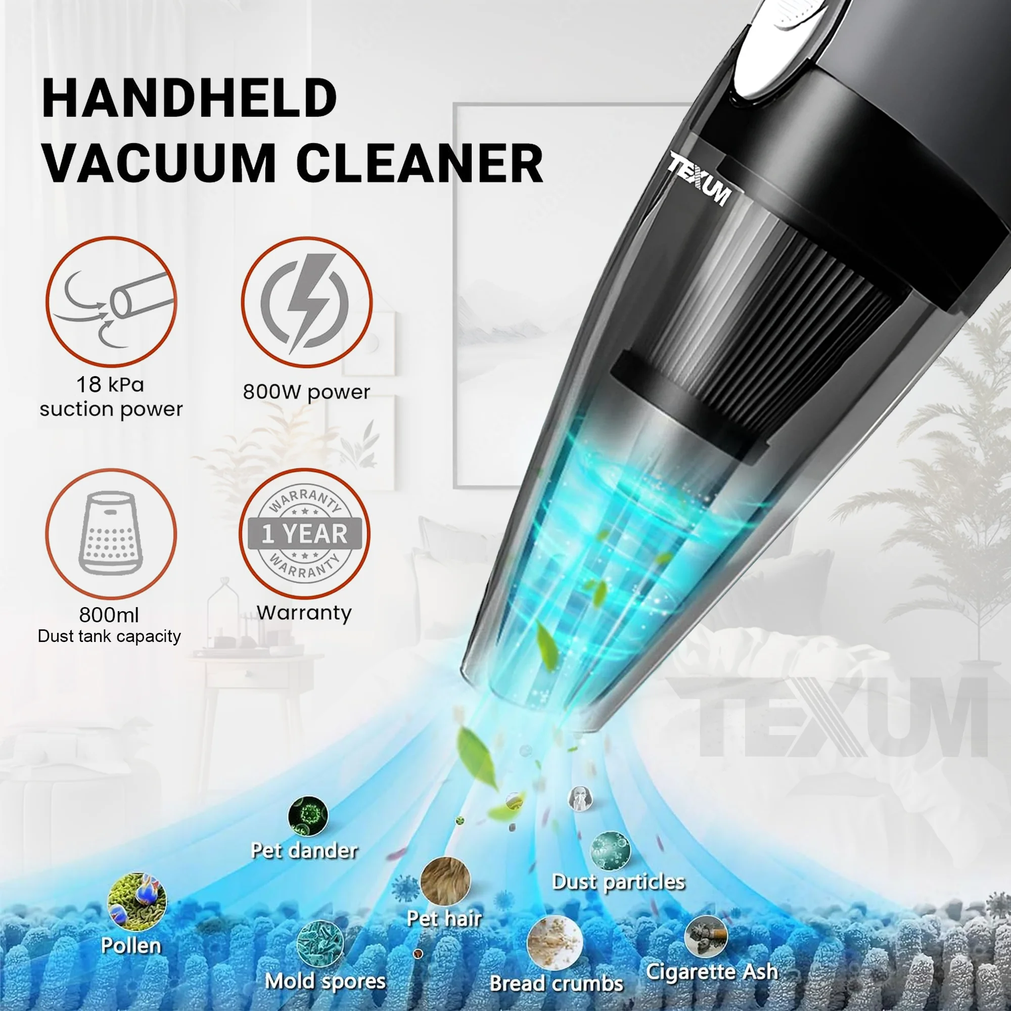 exum TVC-5D 800 Watts Handheld Vacuum Cleaner – your reliable companion for efficient home cleaning. Engineered for exceptional performance, this dry vacuuming powerhouse boasts a powerful 18 Kpa suction power, ensuring a thorough and quick cleaning experience.With 800 Watts of pure cleaning power, the Texum TVC-5D is designed to tackle dirt, dust, and debris with ease, making it an ideal choice for home use.Enjoy the convenience of a 18 Kpa suction power, allowing you to effortlessly clean various surfaces in your home, from carpets to hardwood floors and more.The Texum TVC-5D is crafted with a lightweight yet durable body, making it easy to maneuver and handle during your cleaning sessions. Experience the perfect balance of power and convenience.The Texum TVC-5D incorporates cloth filtration for effective dust and allergen removal, ensuring that your home is not only clean but also a healthier environment for you and your family.