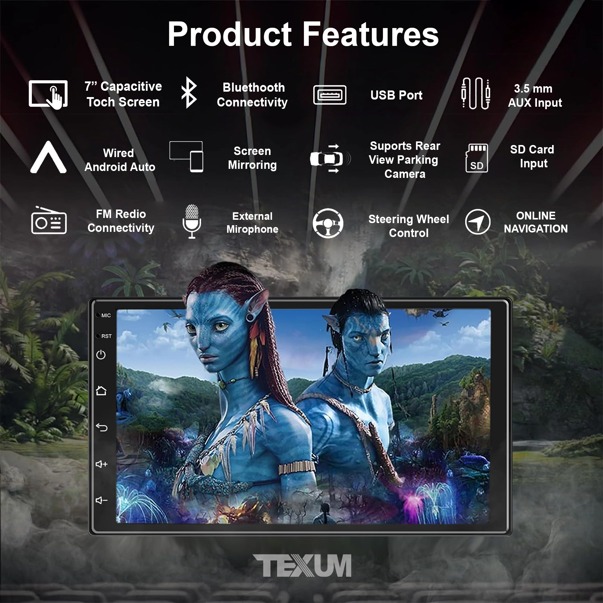 "TEXUM 9 INCH Full Double Din HD Car Screen Stereo – Ultimate In-Car Entertainment Enhance your driving experience with the TEXUM 9 INCH Full Double Din Car Screen Stereo. This advanced media player combines superior audio and video quality with a sleek, user-friendly touch screen interface, making it the perfect upgrade for your car's entertainment system. 9-Inch Touch Screen: Enjoy a crystal-clear display with an intuitive touch screen interface, making navigation and media control effortless. Full Double Din: Designed for seamless integration into your car’s dashboard, providing a sleek and professional look. Versatile Media Playback: Supports various audio and video formats, ensuring compatibility with all your favorite media. Bluetooth Connectivity: Stream music wirelessly and make hands-free calls with built-in Bluetooth functionality. USB and SD Card Ports: Easily connect your USB devices or SD cards for expanded media options. FM Radio: Tune in to your favorite radio stations with the built-in FM tuner. Auxiliary Input: Connect additional devices with the convenient AUX input for versatile audio options. Steering Wheel Control Compatibility: Allows for easy control of your stereo using your car's steering wheel controls, enhancing safety and convenience."