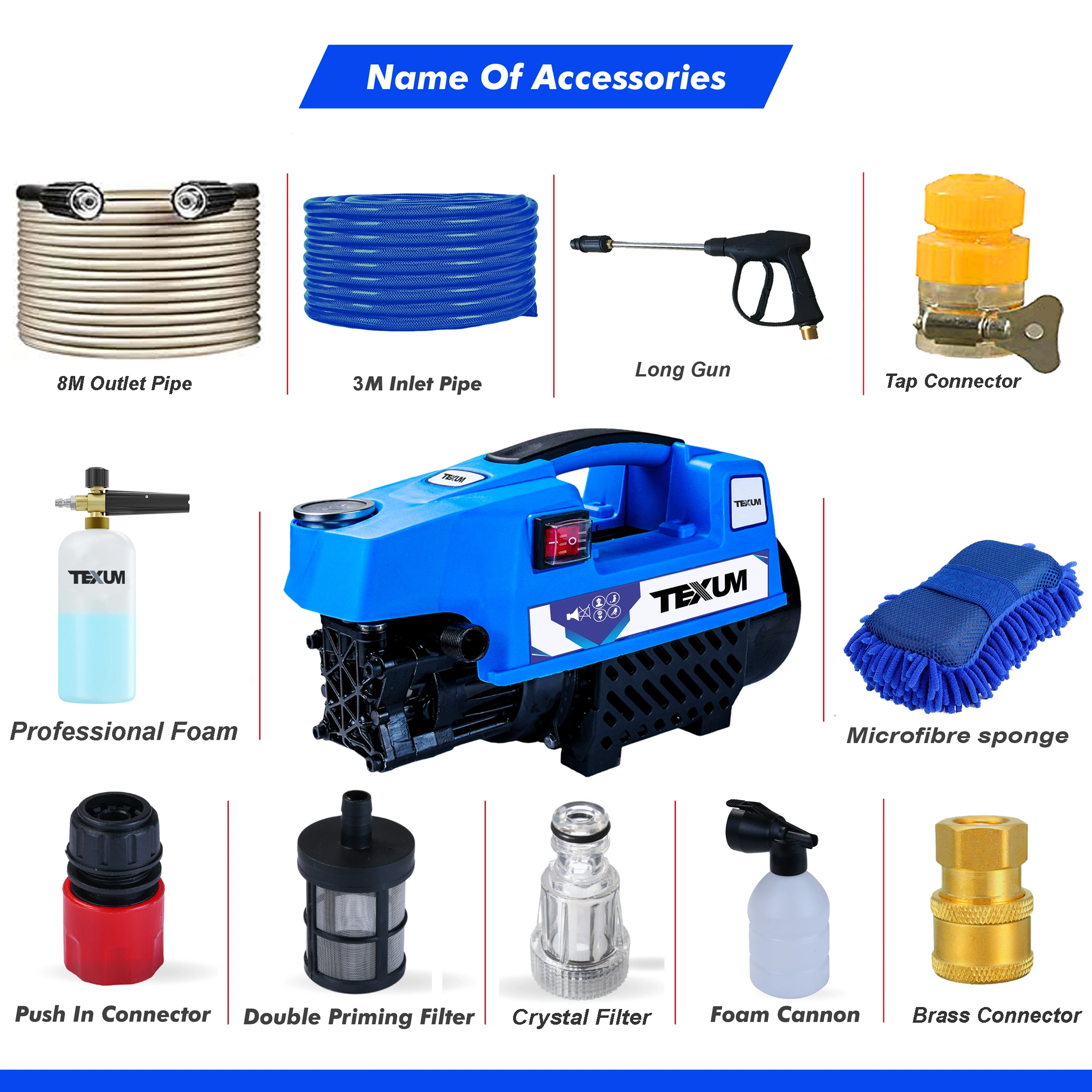- This portable car washer machine comes with some accessories like Inlet Hose Pipe, Outlet Hose Pipe, Filter, Adjustable Pressure or Spray Gun, Quick Connector, Adaptor and Professional Foam Bottle etc.