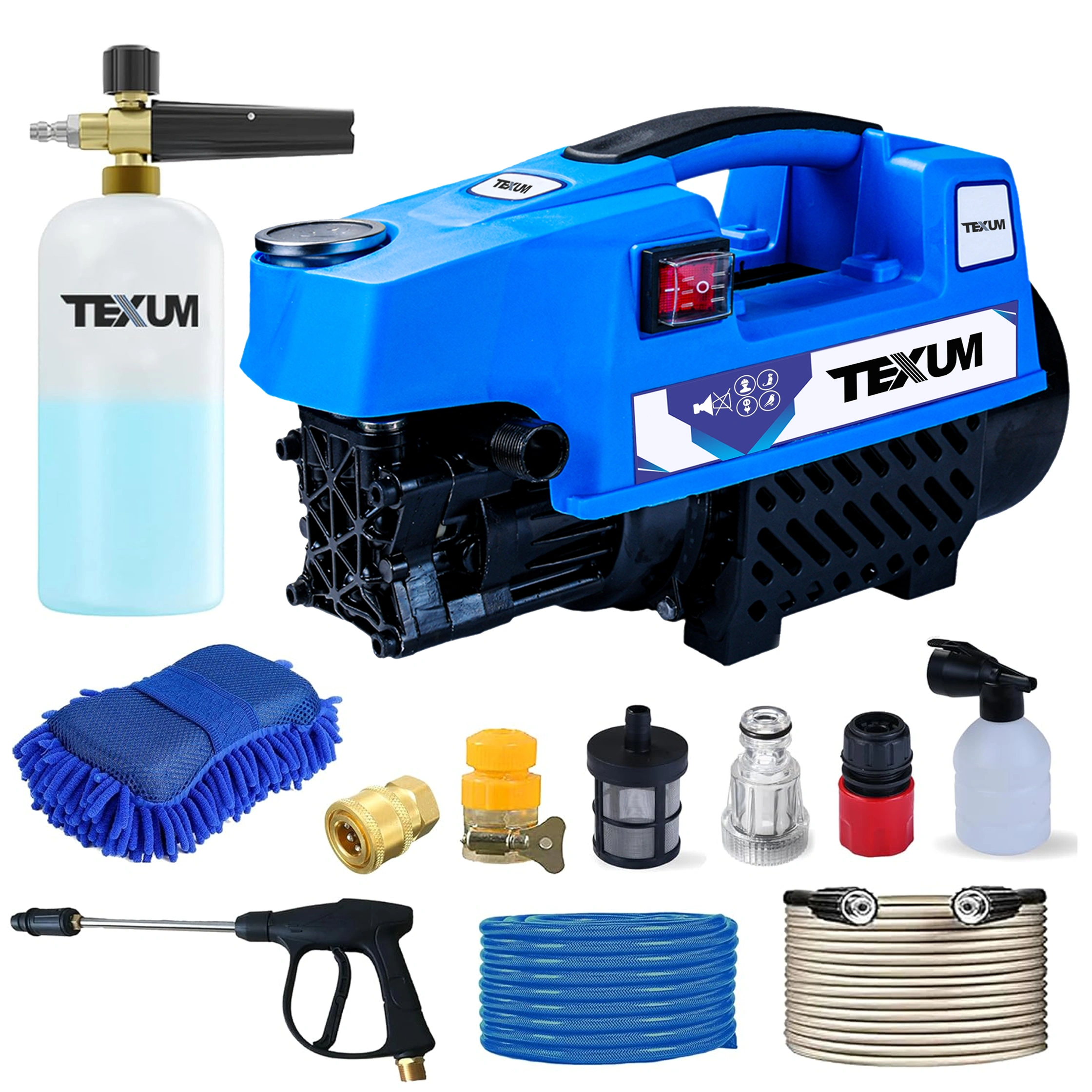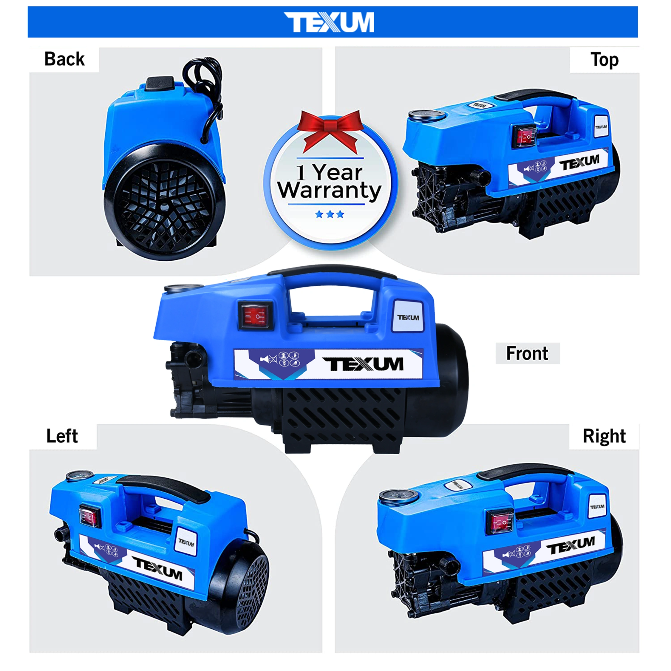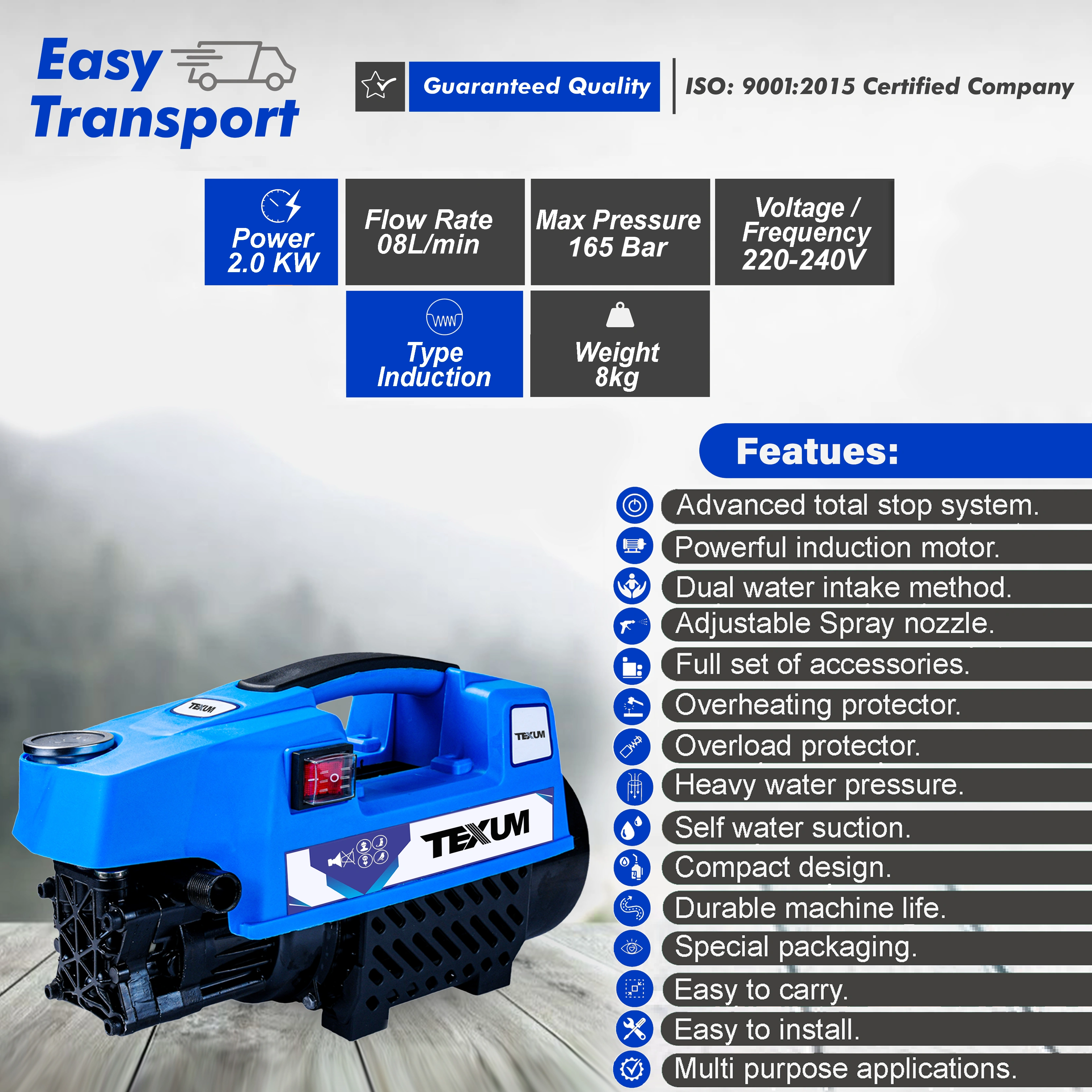 - Texum TX-25D electric portable high pressure car washer pump 2000 watts motor power and 8 LPM of Flow Rate.
